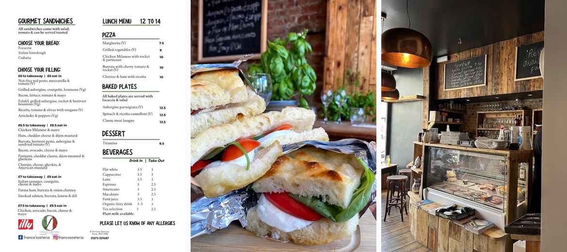 At Franco's Osteria Deli, immerse yourself in the authentic flavors of Italy without leaving Hove. Our menu showcases rustic dishes crafted from fresh, locally-sourced ingredients and imported Italian specialties, celebrating culinary traditions from across the Italian peninsula. Whether you're indulging in a hearty brunch, a cozy lunch, or a romantic dinner, our casual yet trendy atmosphere is perfect for everyone—from families to solo diners. Enjoy great coffee, fine wines, and delightful desserts, all complemented by top-notch service. Visit us at 4 Victoria Terrace for an Italian culinary experience that feels like home.Diners frequently rave about the warm and inviting atmosphere at Franco's Osteria Deli. Many appreciate the no-menu concept, which lets the kitchen surprise them with daily specials made from seasonal ingredients. This unique approach means every visit feels fresh and exciting. The antipasto sharing plates are a hit, catering to those who love to indulge in a variety of flavors. Many reviews commend the wine selection, particularly the excellent Passerina varietal, enjoyed by patrons throughout the evening.